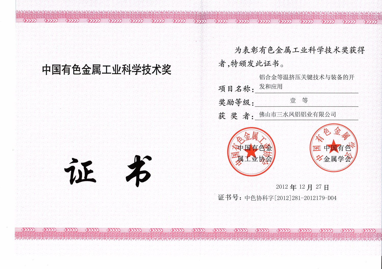 中国有色金属工业科学技术一等奖